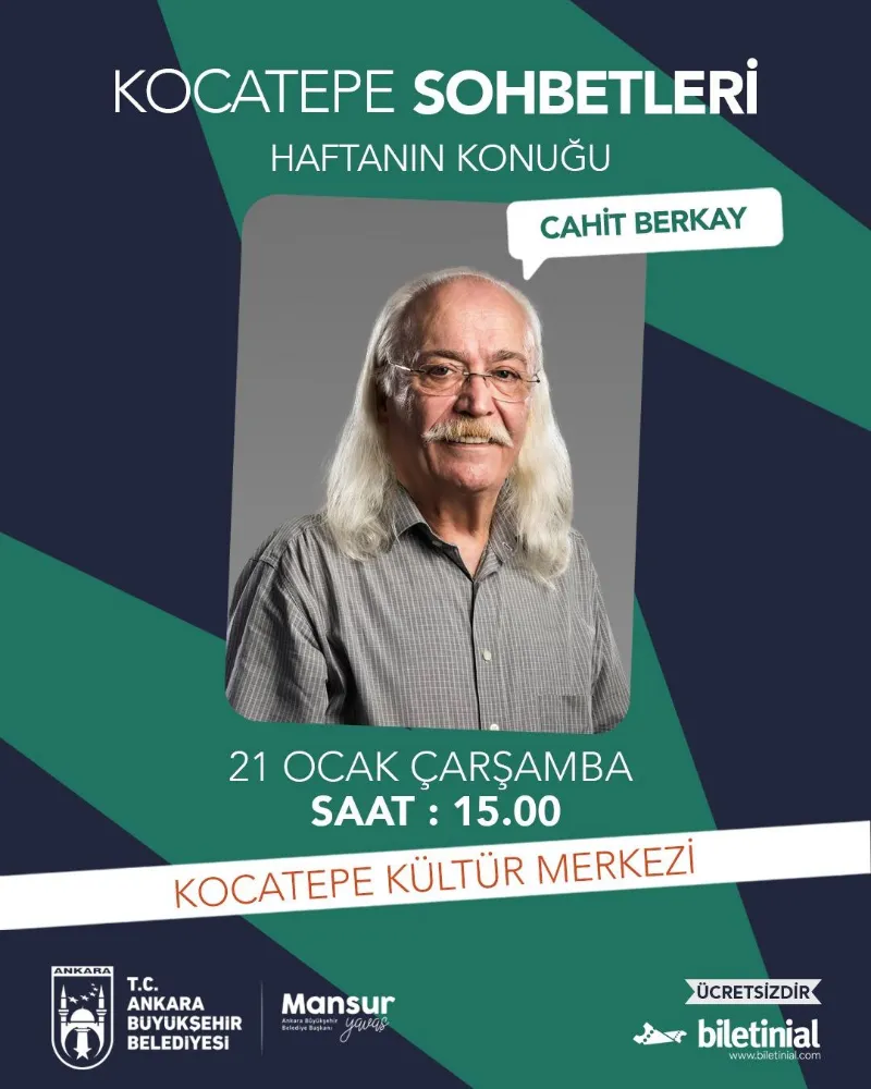 ANKARA- 20.01.2026- Ankara Büyükşehir Belediyesi (ABB), Kocatepe Sohbetleri ile alanında iz bırakan değerli isimleri Ankaralılarla bir araya getirmeye devam ediyor. Türk Müziği’nin usta isimlerinden Cahit Berkay, Kocatepe Sohbetleri kapsamında sanatseverlerle buluşacak. Müzik kariyeri boyunca ürettiği eserlerle kuşaklar arasında güçlü bir bağ kuran Berkay, sanat yolculuğunu, üretim sürecini ve müziğe dair birikimlerini Başkentlilerle paylaşacak.