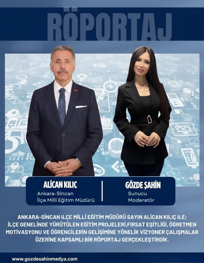 ANKARA- 02.02.2026- Sektörün başarılı Sunucu -Spiker ve Tv Programcılarından aynı zamanda öğretmen olan Gözde ŞAHİN, Ankara Sincan İlçe Millî Eğitim Müdürü Alican Kılıç ile gerçekleştirmiş olduğu, eğitimde fırsat eşitliği, okul yatırımları, ekran bağımlılığıyla mücadele ile sahada yürütülen sosyal ve kültürel çalışmalar başta olmak üzere ilçede eğitimin birçok yönünü ele almış oldukları , eğitimin bugünü ve geleceğine dair önemli röportajı sizlerle…