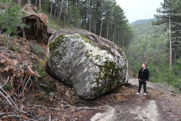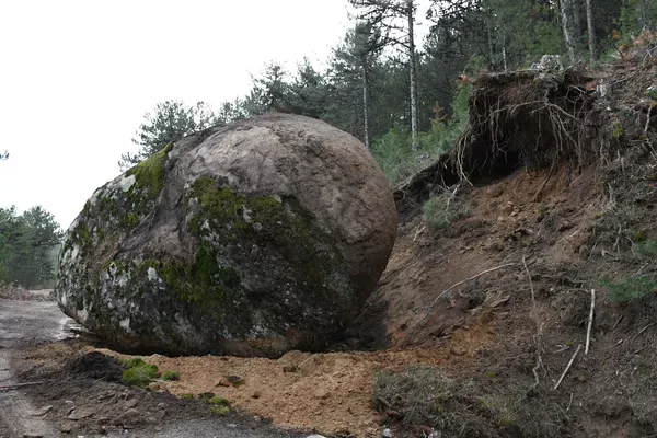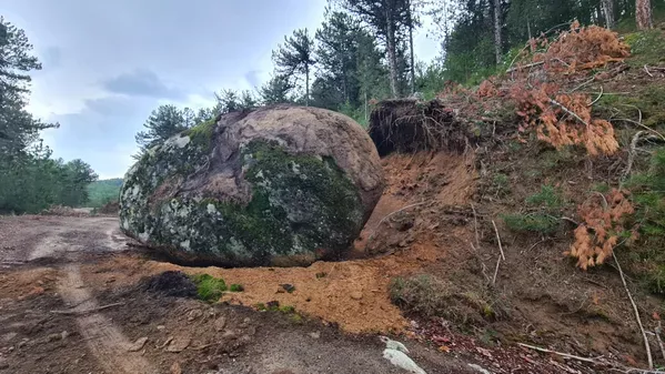 KÜTAHYA- 28.10.2025- Balıkesir'in Sındırgı ilçesinde yaşanan deprem sonrası gün ağarınca ortaya çıkan görüntülere bir tane Kütahya'nın Emet ilçesinden eklendi. Mantar toplamaya çıkan bir adam daha önce farklı bir yerde olduğunu söylediği dev kayayı yola yuvarlanmış halde gördü.