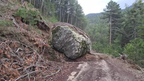 Sındırgı'da meydana gelen 6.1 büyüklüğündeki depremin ardından,Kütahya'nın Emet ilçesinde yamaçtan kopan kaya, orman yolunu kapattı