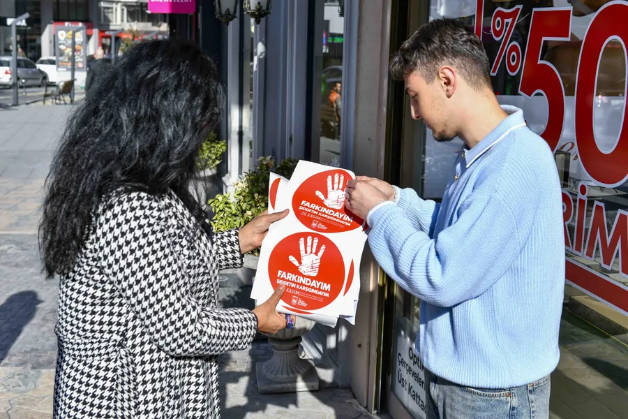 Ayrıca uygun görülen iş yerlerinin girişlerine, farkındalığı görünür kılmak amacıyla “Farkındayım, Şiddetin Karşısındayım” yazılı yapıştırmalar (stickerlar) asıldı.