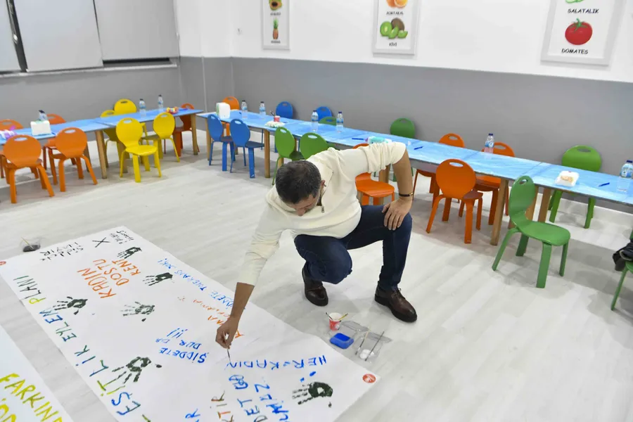 Osmanlı Çocuk Etkinlik Merkezi’nde ise 3-6 yaş grubu çocukların babalarına yönelik bir farkındalık programı düzenlendi. Toplumsal cinsiyet eşitliği ve kadına karşı şiddetin önlenmesi üzerine yapılan bilgilendirmelerin ardından, erkek veliler beyaz branda üzerine renkli boyalarla sloganlar yazarak şiddete karşı dayanışma mesajları verdi.
