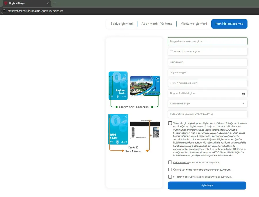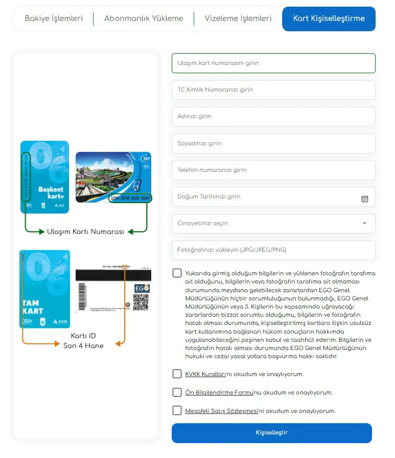 Online kart kişiselleştirme işlemleri, https://baskentulasim.com adresi üzerinden “Kart Kişiselleştirme” sekmesinden gerçekleştirilebiliyor. Uygulama sayesinde anonim kart sahipleri, kartlarını kendilerine özel hâle getirerek hem zaman tasarrufu sağlıyor hem de işlem merkezlerindeki yoğunluğun azaltılmasına katkı sunuyor.
