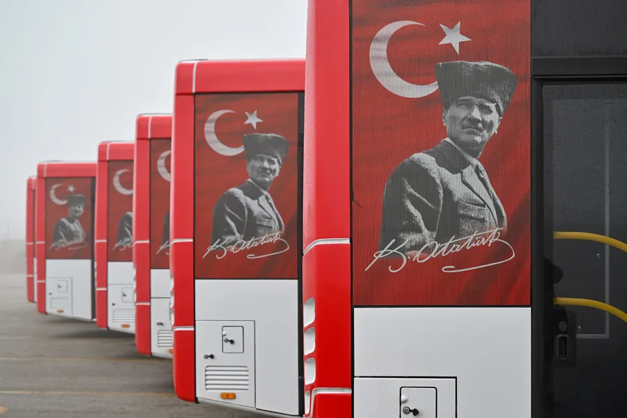 Otobüsler üzerindeki Türk Bayrağı ve Gazi Mustafa Kemal Atatürk resimleri ile dikkat çekiyor.