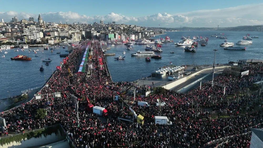 Türkiye Gençlik Vakfı (TÜGVA) öncülüğünde, İnsanlık İttifakı ve Milli İrade Platformu çatısı altında "Sinmiyoruz, susmuyoruz, Filistin'i unutmuyoruz" sloganıyla düzenlenen eylem için Ayasofya-i Kebir Cami-i Şerifi, Sultanahmet Camisi ve Eminönü'ndeki Yeni Cami ile Fatih ve Süleymaniye camilerinin önünde toplanan insanlar, sloganlar ve tekbirler eşliğinde Galata Köprüsü'nde buluştu.