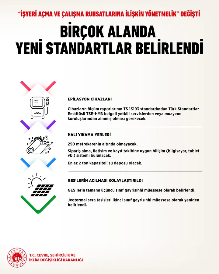 Güneş enerji santrallerinde birinci, ikinci ve üçüncü sınıf gayrisıhhi müessese ruhsatlandırması sınıf tespiti kaldırıldı ve faaliyetin niteliği dikkate alınarak ruhsatlandırmayı kolaylaştırmak, santralleri yaygınlaştırmak ve üretimi artırmak amacıyla GES’lerin tamamı üçüncü sınıf gayrisıhhi müessese olarak belirlendi. Birinci sınıf gayrisıhhi müessese kapsamındaki jeotermal sera tesislerinin sınıfı ruhsatlandırmayı kolaylaştırmak ve üretime katkı sağlamak amacıyla ikinci sınıf gayrisıhhi müessese olarak yeniden belirlendi.