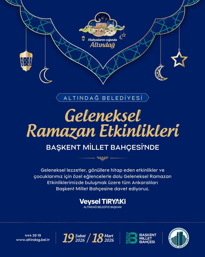 Altındağ Belediyesi’nin ev sahipliğinde gerçekleştirilecek Geleneksel Ramazan etkinlikleri, bu yıl da ziyaretçilere, birbirinden keyifli yüzlerce etkinlik sunuyor. Altındağ Belediyesi tarafından Başkent Millet Bahçesi’nde 19 Şubat –18 Mart tarihleri arasında düzenlenecek etkinliklerde; Ramazan lezzetlerinden tasavvuf konserlerine, semazen gösterilerinden geleneksel Ramazan eğlencelerine kadar birçok program yer alıyor. Ayrıca unutulmayan Türk filmi gösterimleri, dinletiler, tiyatrolar ve gösteriler de ziyaretçilerle buluşuyor.