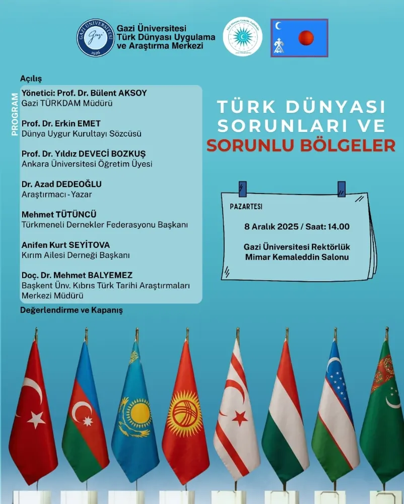 ANKARA- 09.12.2025- Gazi Üniversitesi Türk Dünyası Uygulama ve Araştırma Merkezi (TÜRKDAM), Gazi Üniversitesi Türk Dünyası Gençlik Topluluğu ve Kızılelma Kadın, Gençlik ve Çocuk Derneği tarafından organize edilen “Türk Dünyası Sorunları ve Sorunlu Bölgeler” başlığı altındave takip ettiği bir panel düzenlendi.