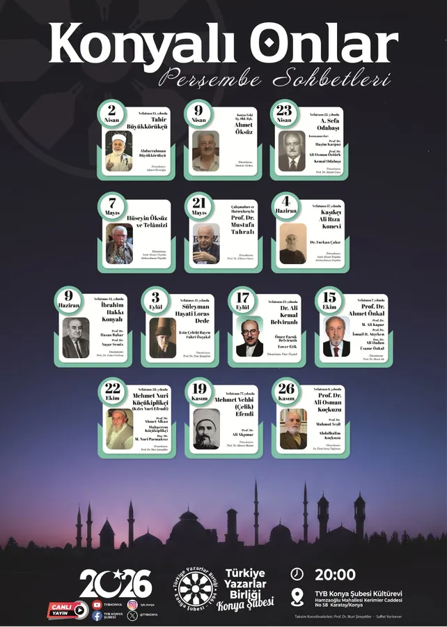 Şehrin manevi mimarlarını ve önemli şahsiyetlerini anmak amacıyla düzenlenen Konyalı Onlar Perşembe Sohbetleri, 2026 yılında da devam ederek 13 programla ilgilileriyle buluşacak. Bu özel buluşmalarda; Tahir Büyükkörükçü, Ahmet Öksüz, A. Sefa Odabaşı, Hüseyin Öksüz, Prof. Dr. Mustafa Tahralı, Kaşıkçı Ali Rıza Konevî, İbrahim Hakkı Konyalı, Süleyman Hayati Loras Dede, Dr. Ali Kemal Belviranlı, Prof. Dr. Ahmet Önkal, Mehmet Nuri Küçükiplikçi (Kılcı Nuri Efendi), Mehmet Vehbi (Çelik) Efendi ve Prof. Dr. Ali Osman Koçkuzu gibi Konya’nın ruhuna dokunan isimler gündemde olacak.
