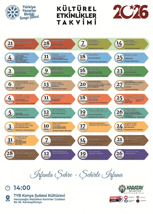 Köseoğlu, programları dijital platformlardan takip eden ya da yüz yüze katılmak isteyen, kültüre, sanata ve düşünce hayatına ilgi duyan herkesi Türkiye Yazarlar Birliği Konya Şubesi’nin faaliyetlerine davet ettiklerini söyledi.