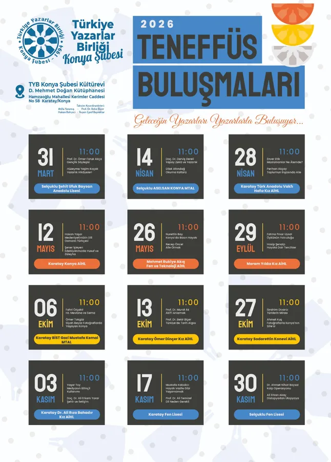 Genç nesillerle kültürel köprüler kurmayı hedefleyen Teneffüs Buluşmaları, bu yıl 12 farklı okulu ağırlayacak. Konya İl Milli Eğitim Müdürlüğü iş birliği ile gerçekleşecek programlar kapsamında; Selçuklu Şehit Ufuk Baysan Anadolu Lisesi, Selçuklu ASELSAN KONYA MTAL, Karatay Türk Anadolu Vakfı Hafız Kız AİHL, Karatay Konya AİHL, Mehmet Rukiye Akış Fen ve Teknoloji AİHL, Meram Yıldız Kız AİHL, Karatay BİST Gazi Mustafa Kemal MTAL, Karatay Ömer Dinçer Kız AİHL, Karatay Sadrettin Konevi AİHL, Karatay Dr. Ali Rıza Bahadır Kız AİHL, Karatay Fen Lisesi ve Selçuklu Fen Lisesi öğrencileri TYB çatısı altında yazarlar ve kitaplarla buluşacak.