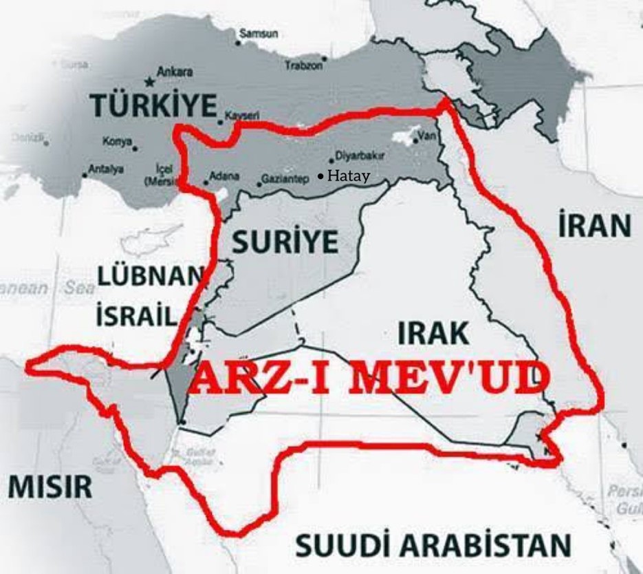 Gelelim “Büyük İsrail” haritasına… Bunda da yine Türkiye’nin Doğu ve Güneydoğu bölgelerinin tamamı, İç Anadolu’nun bir kısmı, Akdeniz Bölgesi’nin Doğu tarafı, Suriye, Irak, Lübnan, Filistin, Ürdün’ün tamamı, Suudi Arabistan’ın kuzeyinde çok büyük bir bölge, İran’ın Batı şeridinin tamamı ile Nil’e kadar Mısır’ın Sina bölgesinin hepsi, İskenderiye’ye kadar bütün coğrafya Siyonizm’in hedefinde görülmektedir.